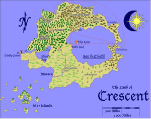 This campaign takes place in the land of Crescent. The main land mass is a crescent shaped continent, approximately 2500 miles across, and about 2000 miles top to bottom. There is a large inland sea (think Mediterranean) approximately 1000 miles across, with one entrance to the greater ocean on the east side of the continent.