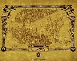 Corvis is a city on the northern shore of the Sea of Shadows. A small city with a large fisherman population, it has lately grown in size and popularity because of the discovery of a large vein of silver in a pass north of the city.
