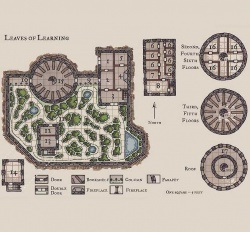 The Tower of Tomes is flanked by a pair of cloisters that face inward toward a walled, forested garden where cascades of endlessly pumped water babble past many small bowers and contemplation nooks. At the far end of the East Cloister is the Scroll House, where the temple staff dwell amid newly acquired books and scrolls to be repaired and cataloged.